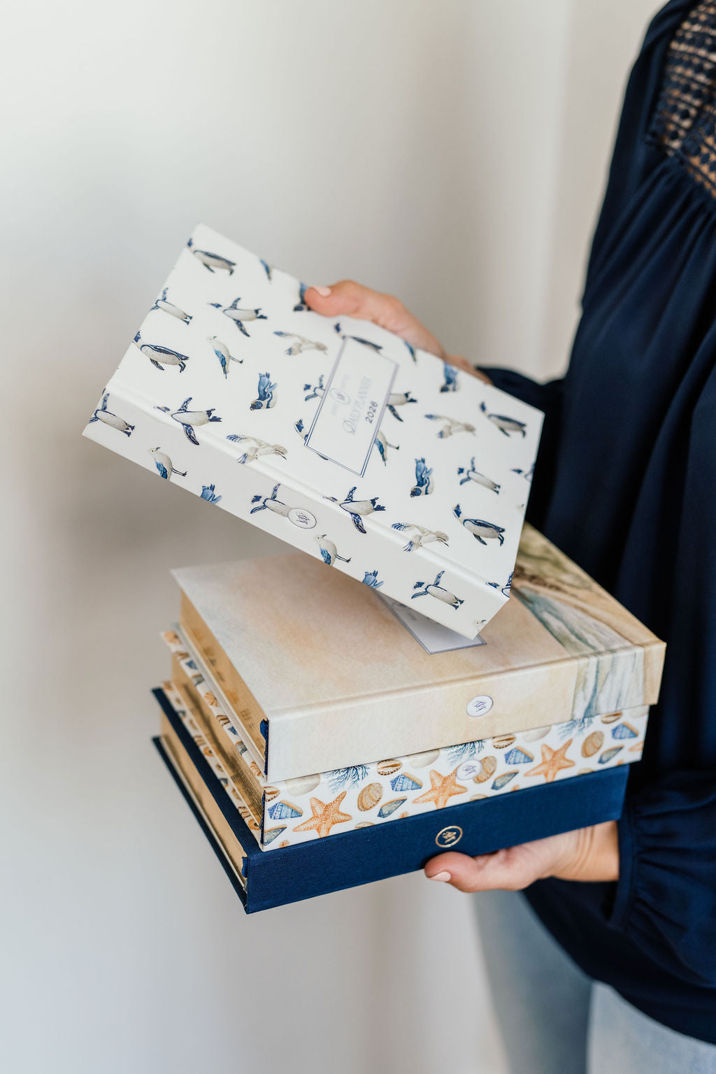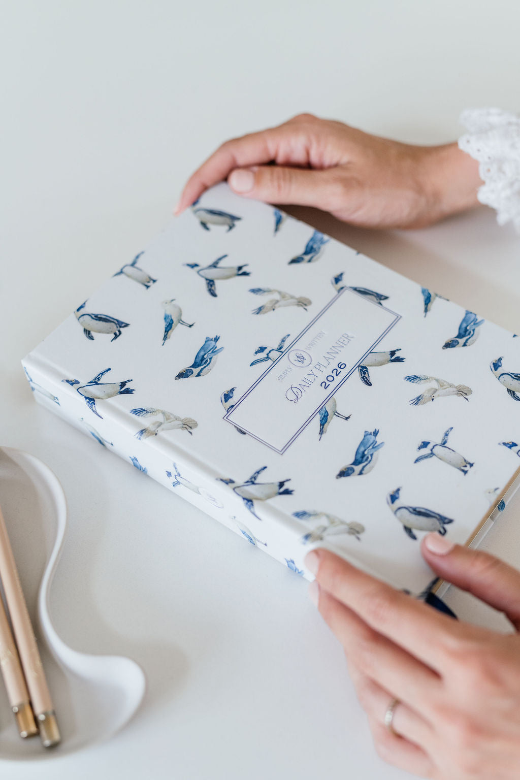 The African Penguin Daily Planner captures the quiet beauty of our southern coastline in a monochrome palette of deep blue and white. Minimalist yet full of character, it features delicate illustrations of the African Penguin and the Hartlaub’s Gull — two coastal icons that embody balance, grace, and quiet resilience. Calm and considered, this planner brings a sense of stillness to your workspace — a companion for those who value simplicity, focus, and thoughtful design.