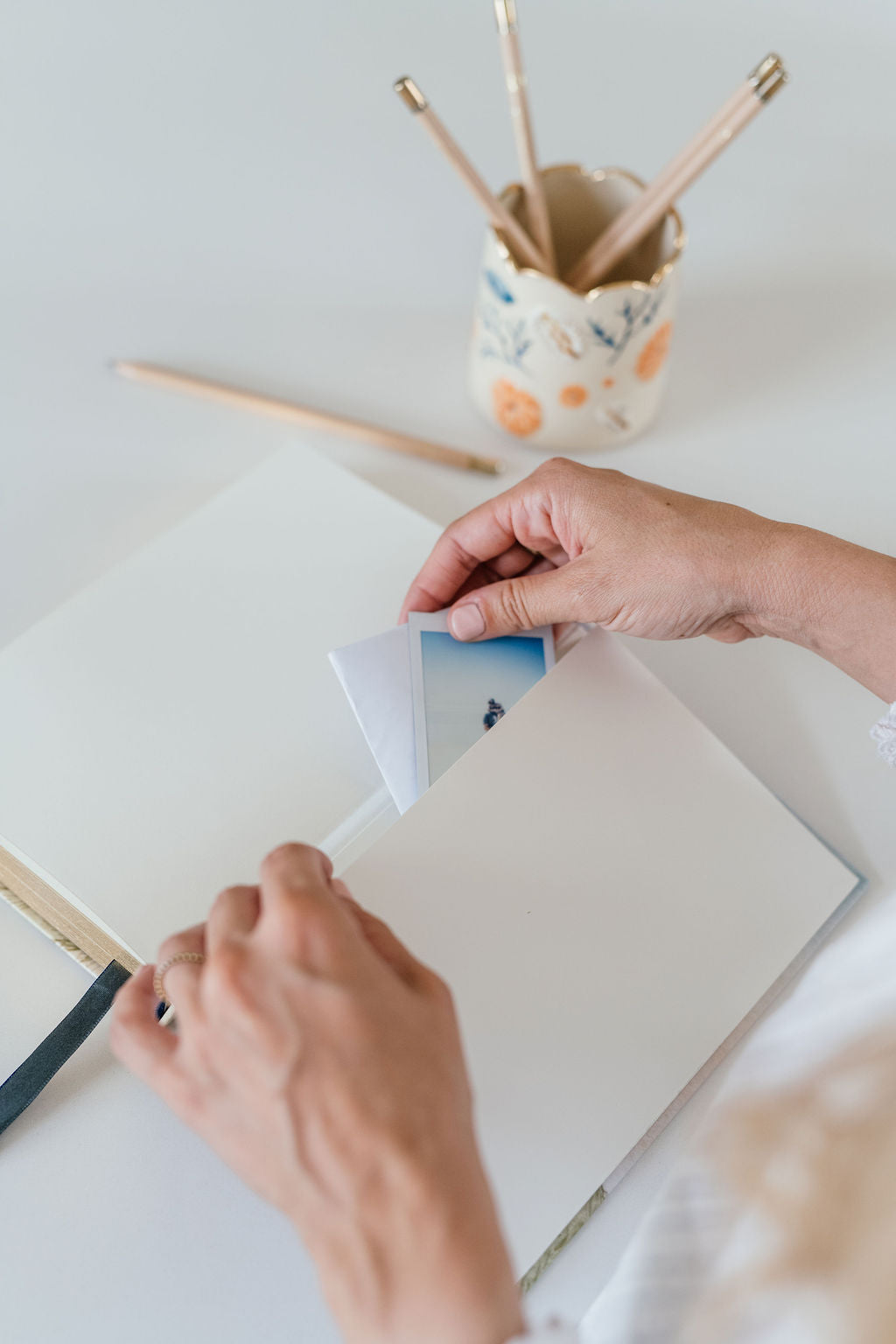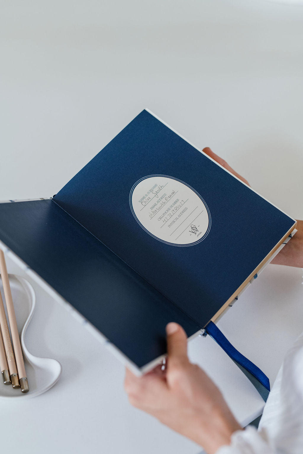 Finishing Touches: A back pocket for loose notes, gilded edges and two satin ribbons to mark your place in style.